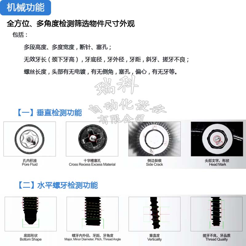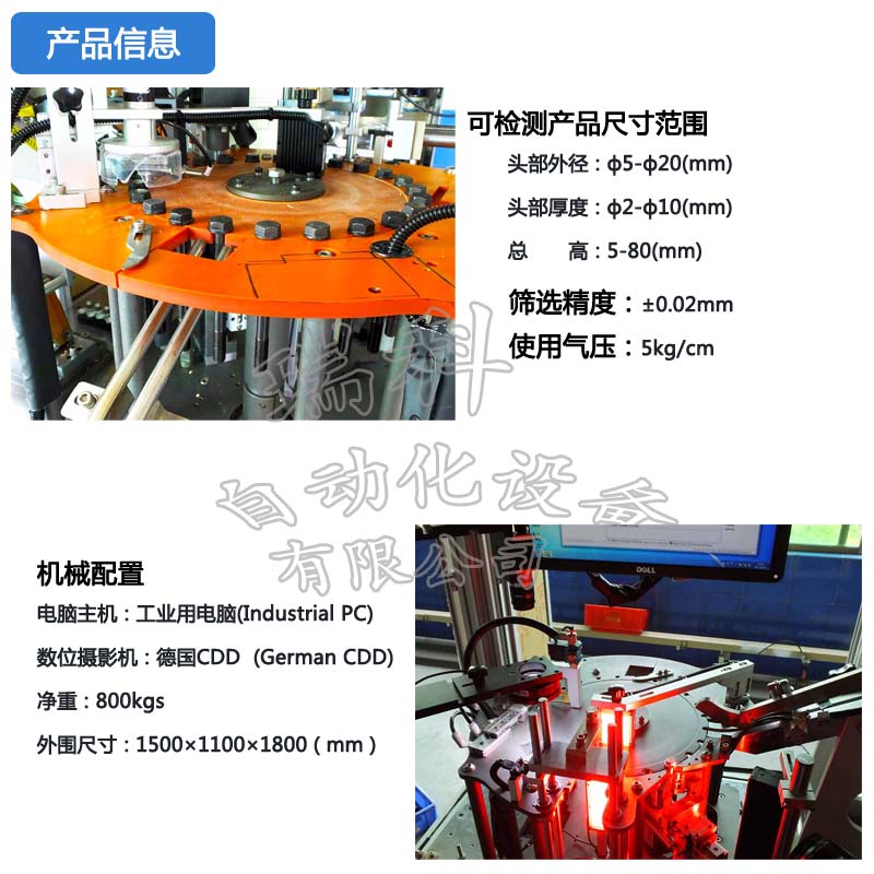 硬体配备包含振动送料机、下料轨道、检验平台、计算机系统為一安全、便利,且节省人力成本的自动化设备。分别介绍如下: