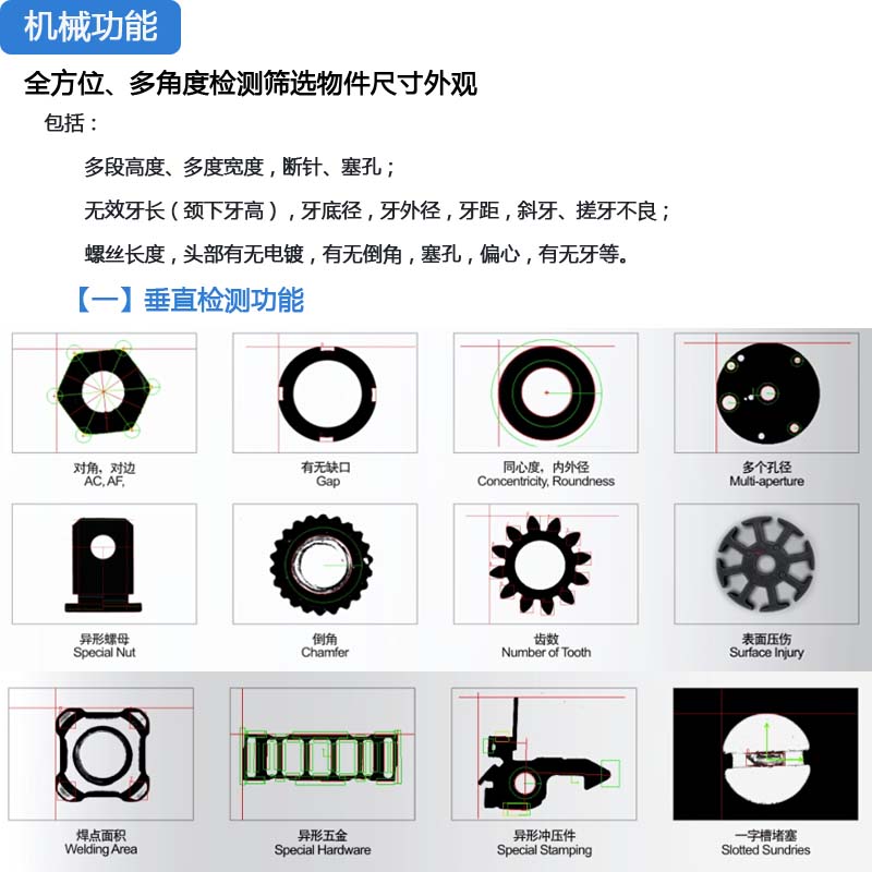 • 本系统检测功能包括多段高度、多度宽度,断针、塞孔,无效牙长(颈下牙高),牙底径,牙外径,牙距,斜牙、搓牙不良,螺丝长度,头部有无电镀,有无倒角,塞孔,偏心,有无牙。