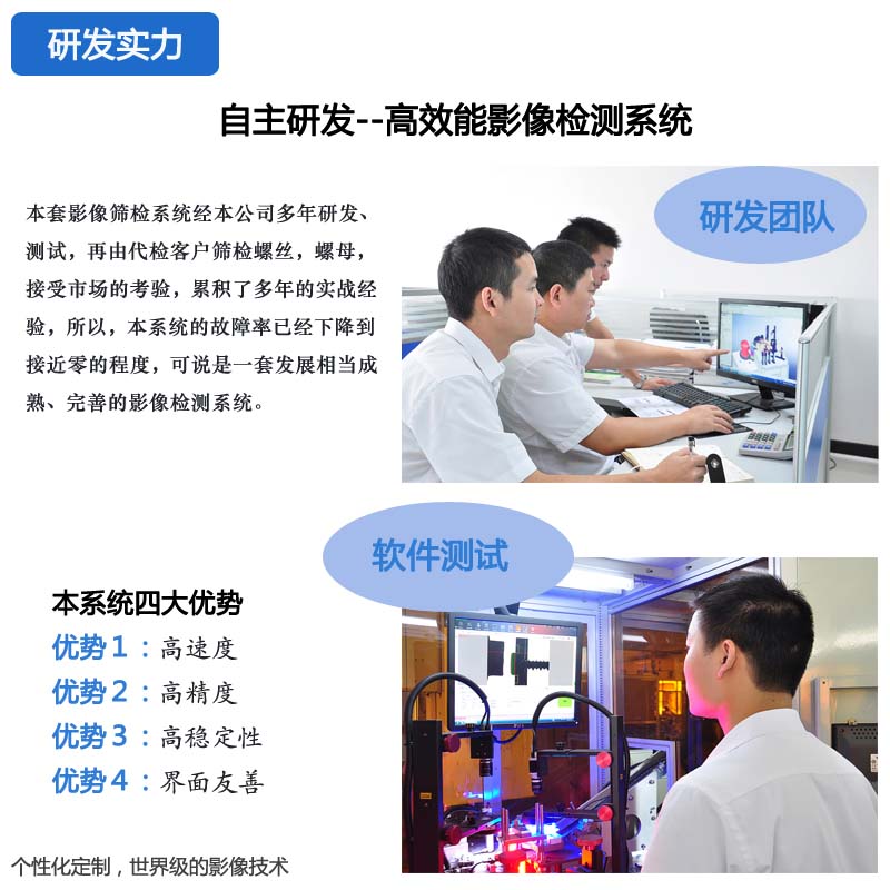 • 本系统检测功能包括多段高度、多度宽度,断针、塞孔,无效牙长(颈下牙高),牙底径,牙外径,牙距,斜牙、搓牙不良,螺丝长度,头部有无电镀,有无倒角,塞孔,偏心,有无牙。
